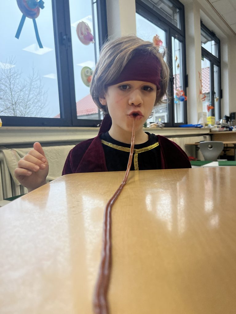 Das Highlight des Tages war das alljährliche Kellnerspiel, bei dem die Kinder mit viel Spaß und Geschick einen Parcours mit zu großen Gummistiefeln, einer Weste und einem Hut absolvieren mussten, während sie ein Tablett in der Hand hielten. Ein bisschen Chaos war vorprogrammiert, wenn mal etwas herunterfiel – aber zum Glück waren stets hilfsbereite Mitschüler zur Stelle, um das Durcheinander schnell zu beseitigen und den Spaß am Spiel zu bewahren.